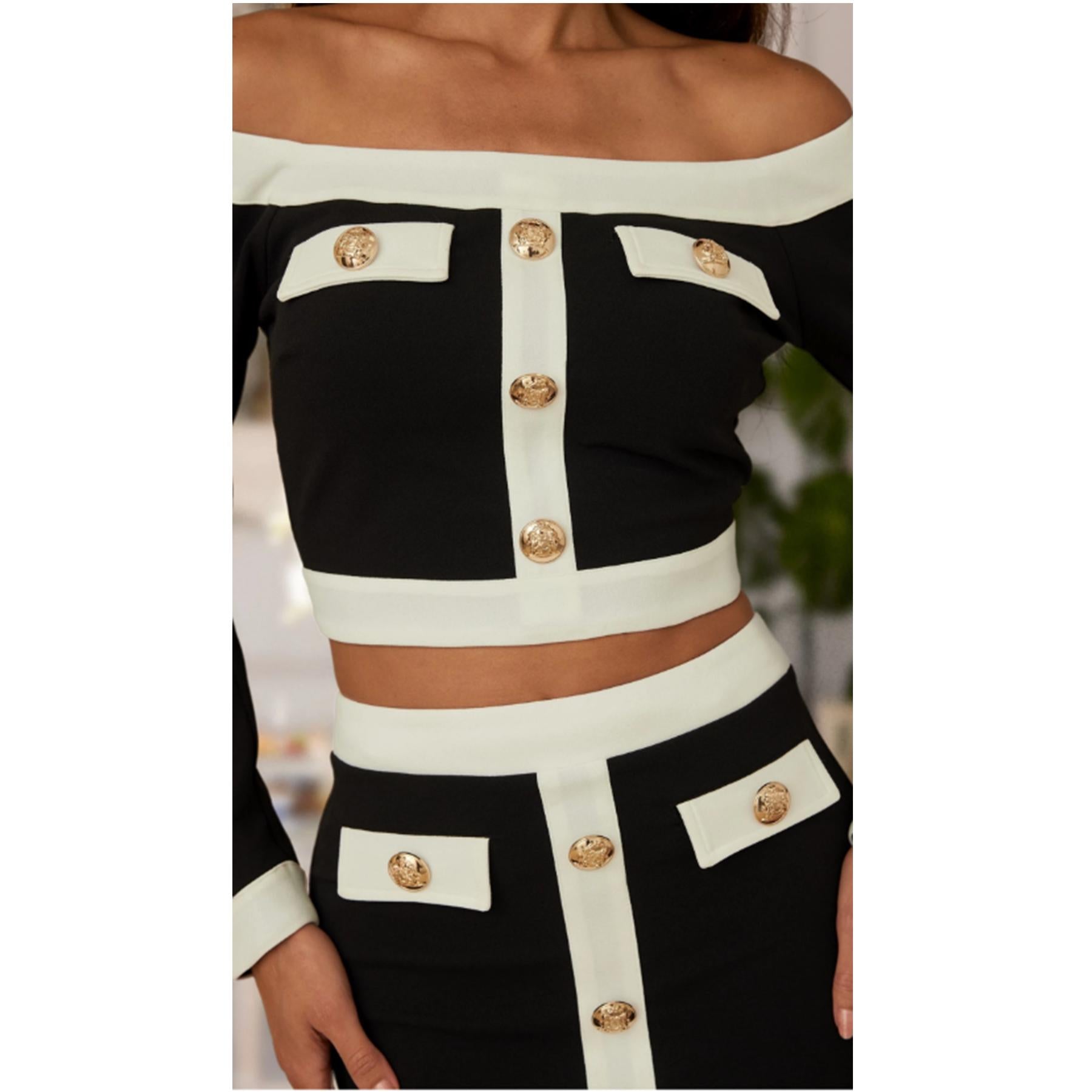 Elevate your wardrobe with this stylish two-piece set, featuring a black and white color scheme. This set includes a mid-skirt design with a gold button detail, making it a versatile addition to your collection.